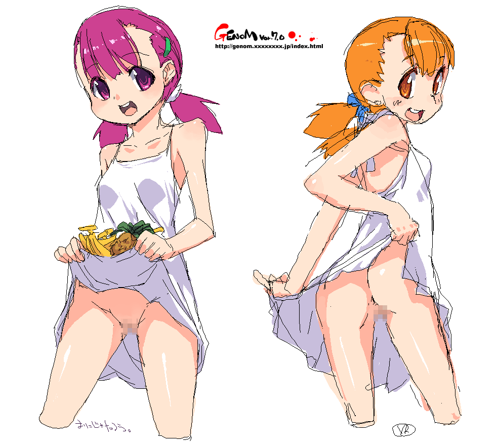 :d2girlsassbananabottomlesscensoredclothes liftcropped legsdressdress liftflat chestfoodfrom behindfruitjaggy lineslolimultiple girlsno pantiesoekakiopen mouthorange eyesorange hairpink eyespink hairpussysimple backgroundsketchskirt basketsmiletwintailswatermarkweb addresswhite backgroundwhite dress