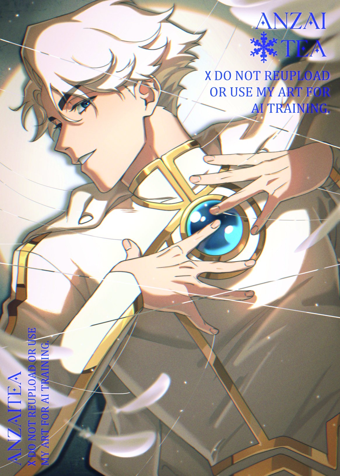 1boyanzaiteaartist nameblue eyesbroken glasscapeglasslooking at viewermale focusshort hairsoloteethupper bodywatermarkwhite capewhite hair