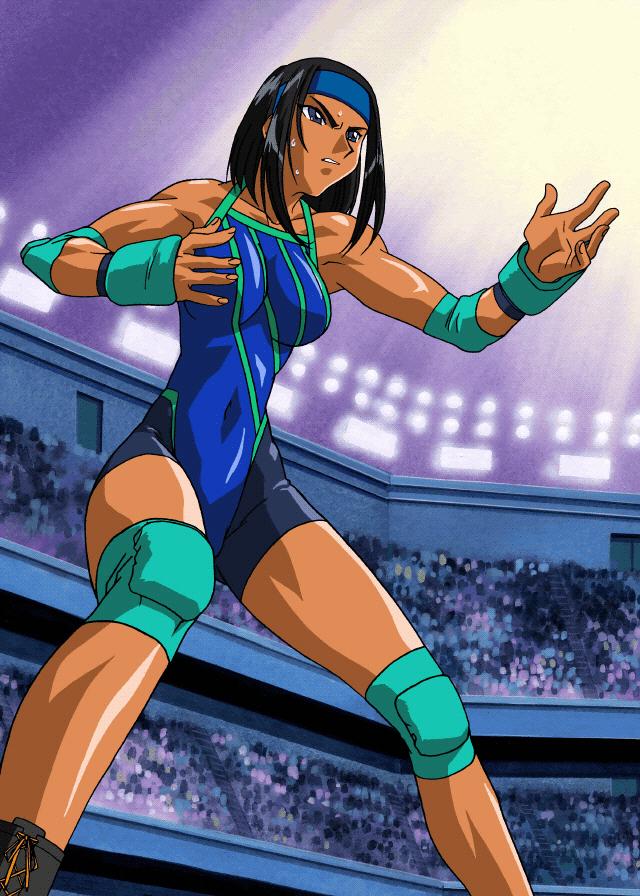 1girlblack hairblue eyesdark skindark-skinned femalefemale focusheadbandknee padsshort hairsolosweatdroptonedtoned femalewrestling