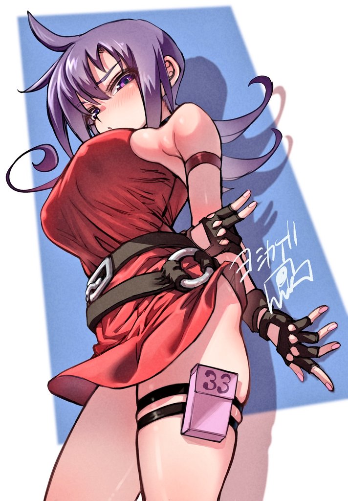 1girlarm behind backblack glovesblue backgroundblushbreastscowboy shotdressfingerless glovesgloveslarge breastsmicrodresspurple eyespurple hairsimple backgroundsleevelesssleeveless dresssolothigh strapwhite background