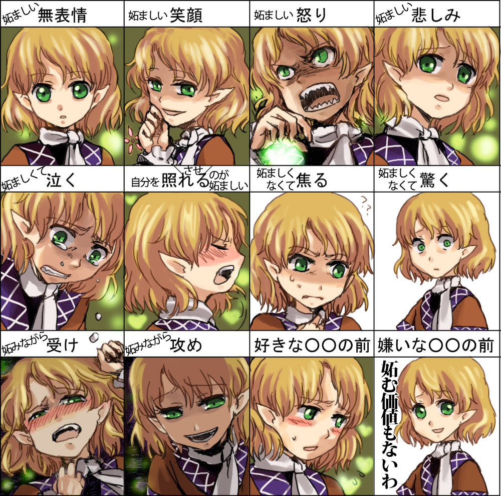 1girlblonde hairblushchartfemale focusgreen eyesjealouslooking at viewermultiple expressionsmultiple viewspointy earssharp teethtearsteeth