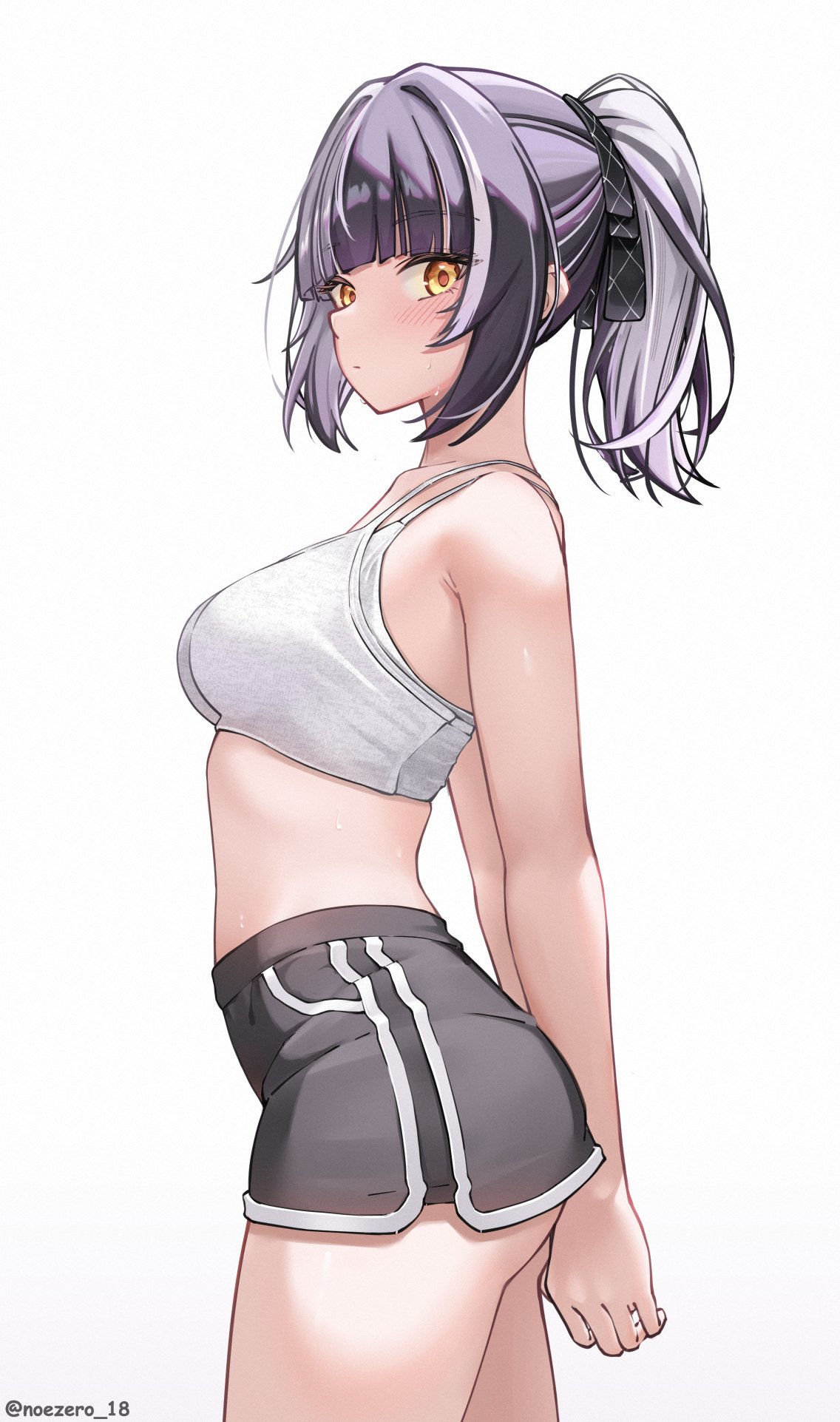 tomahawk (nagarebosi8492), kitasan black (umamusume), umamusume, 1girl, adapted costume, ahoge, alternate costume, animal ears, arm up, bare shoulders, black bodysuit, black gloves, black hair, black sleeves, bodysuit, breasts, cleavage, cleavage cutout, closed mouth, clothing cutout, color guide, detached sleeves, gloves, gradient background, grey background, hair between eyes, hair ornament, hair ribbon, horse ears, horse girl, horse tail, kouhaku nawa, large breasts, latex, latex bodysuit, looking at viewer, multicolored hair, red eyes, red ribbon, ribbon, rope, shimenawa, shiny clothes, short hair, simple background, skin tight, smile, solo, streaked hair, tail, taimanin suit, two-tone hair, watermark, white background, white hair