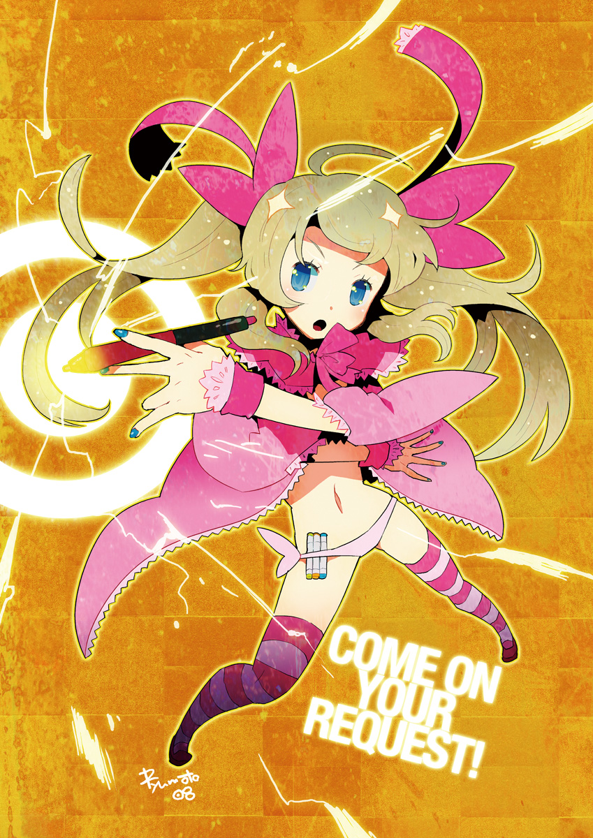 1girlblonde hairblue eyesblue nailsenglish textengrish textfemale focusfull bodyhair ribbonlong hairnail polishpantiespenpink thighhighsranguageribbonside-tie pantiessolostriped clothesstriped thighhighsthighhighsunderwearyellow background