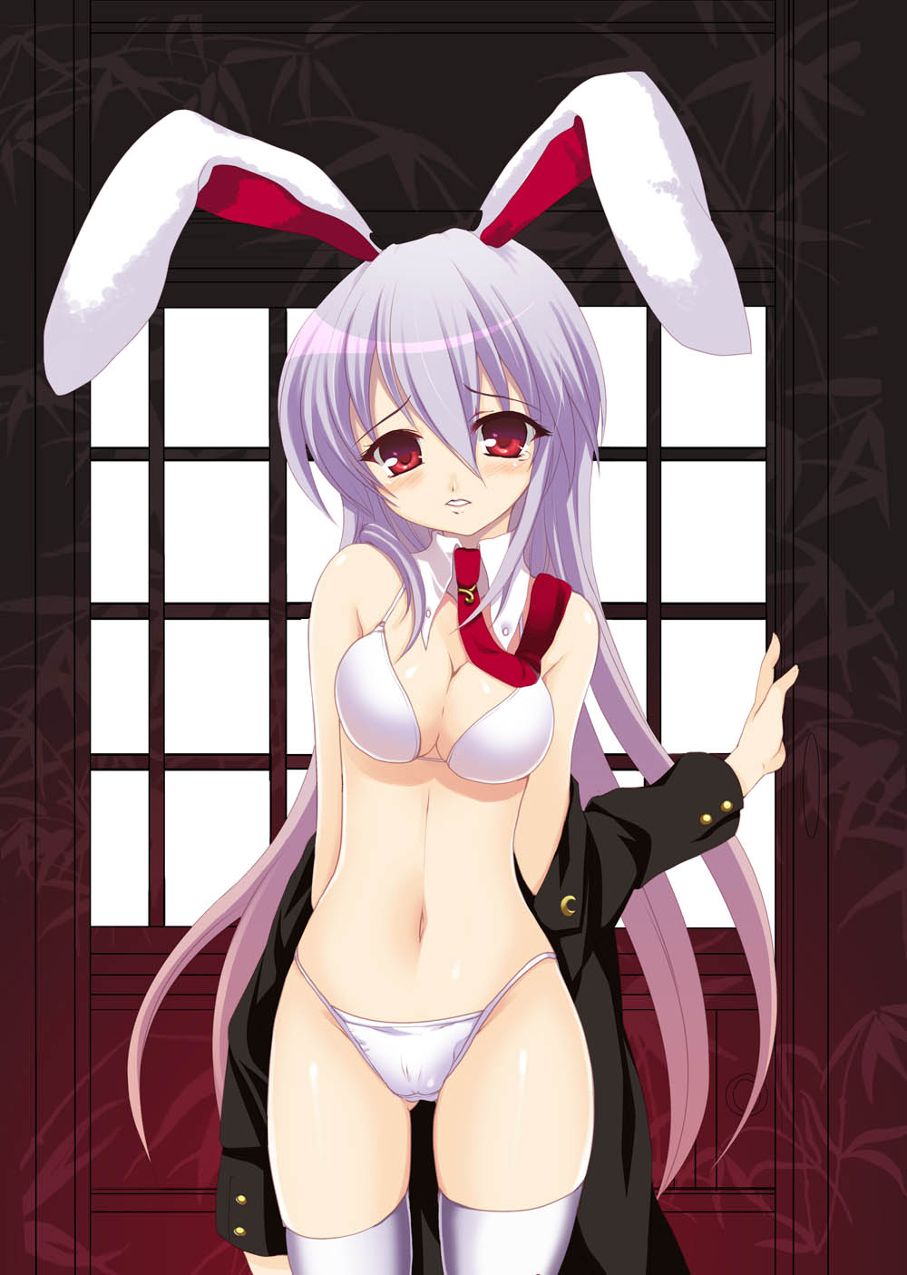 1girlanimal earsblazerblushbrabreastsfemale focusjacketlarge breastslingerielong hairnecktiepantiespink hairpurple hairrabbit earsred eyesred necktiesolotearsthighhighsunderwearundressingvery long hairwhite thighhighs