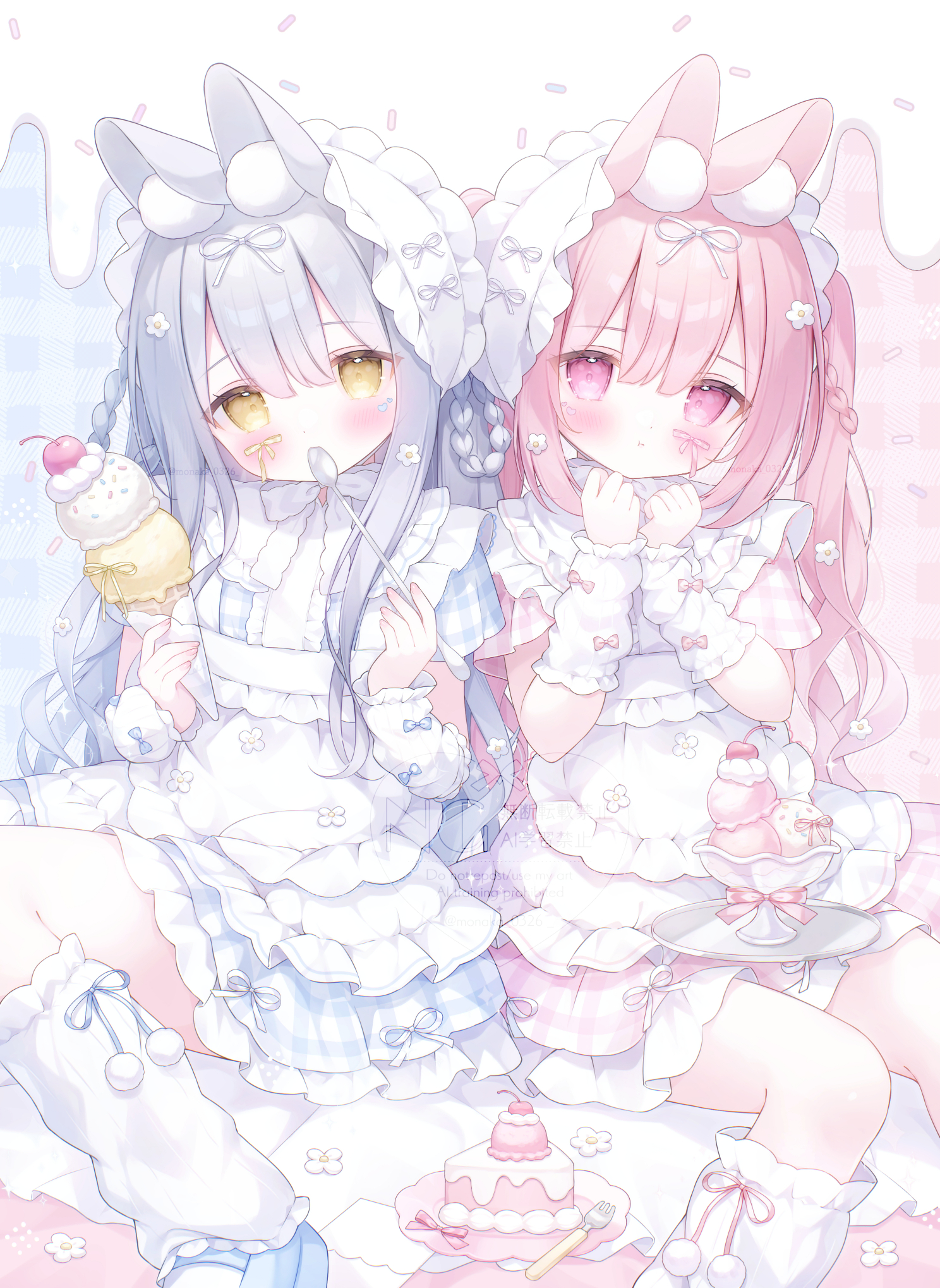 2girlsanimal ear fluffanimal earsapronarm warmersblue hairblue shoesblushcakecake sliceclosed mouthdressfeet out of framefoodforkfrilled apronfrilled dressfrillshands uphatholdingholding foodholding ice creamholding spoonice creamlong hairlooking at viewermultiple girlspink eyespink hairplaterabbit earsrabbit girlshoesshort sleevessittingsocksspoonwhite apronwhite dresswhite hatwhite socksyellow eyes