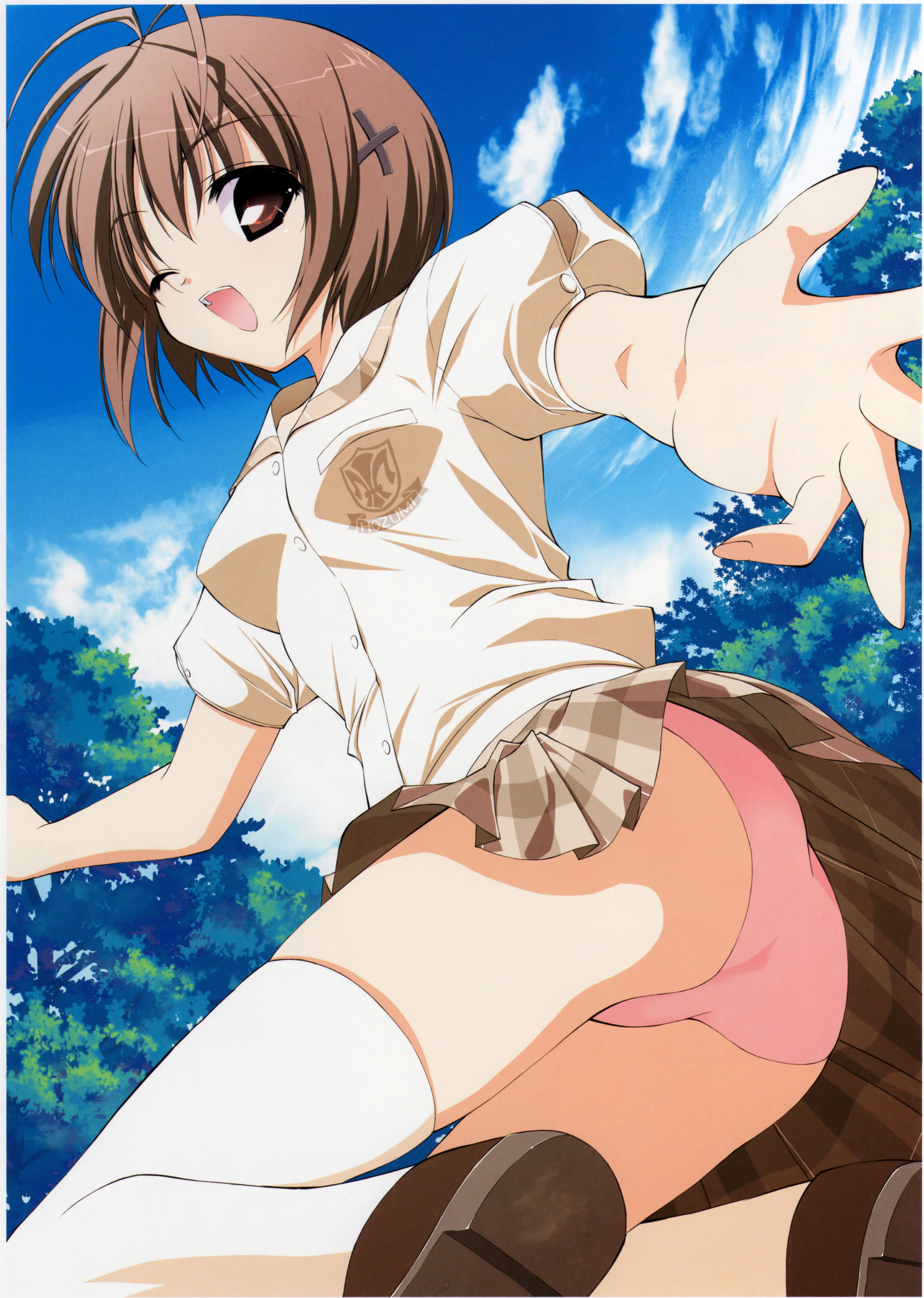 1girlantenna hairbrown eyesbrown hairfemale focuslong legsone eye closedpantiesschool uniformshort hairsolothighhighsunderwearwink