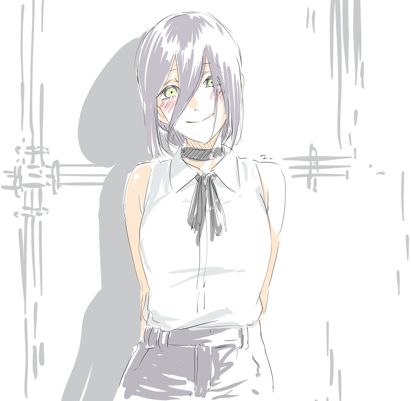 1girlblack chokerblack hairblack ribbonblack shortsblushchokerclosed mouthcollared shirtgreen eyeshair between eyesneck ribbonribbonshadowshirtshirt tucked inshortssleevelesssleeveless shirtsmilesolowhite shirt