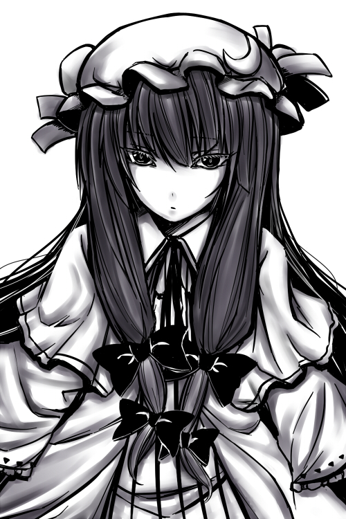 1girlblunt bangsbowclosed mouthcrescentcrescent hat ornamentdressexpressionlessfemale focusgreyscalehair bowhathat ornamentlong hairlooking at viewerlow-tied long hairmob capmonochromemultiple hair bowssimple backgroundsolowhite background