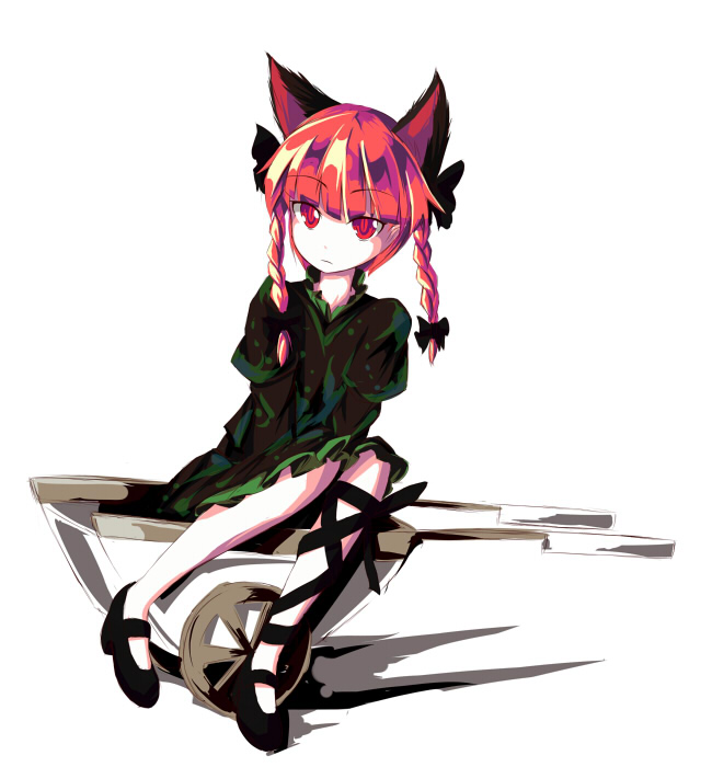 heika (heikahp), copyright request, 1girl, animal ears, barefoot, bed, blush, breasts, brown eyes, cat ears, cat girl, cat tail, collarbone, feet, female focus, hand on own chin, hand on own face, hand on own head, loli, looking at viewer, nipples, nude, pink hair, red hair, sitting, small breasts, solo, tail, toes