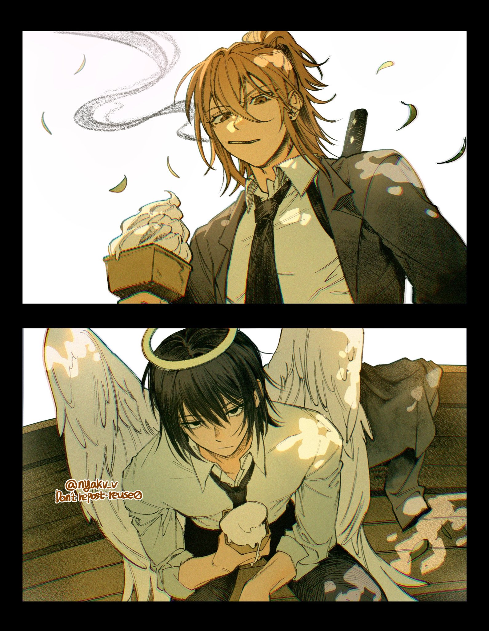 2boysalternate hairstyleangelangel wingsblack hairblack necktieblack pantscigarettecollared shirtfeathered wingsfoodhaloholdingholding foodholding ice creamice creamjacketmale focusmultiple boysnecktienyakv von benchpantsponytailshirtshort hairsittingsuit jackettopknottraditional halotwitter usernameweaponweapon on backwhite shirtwhite wingswings