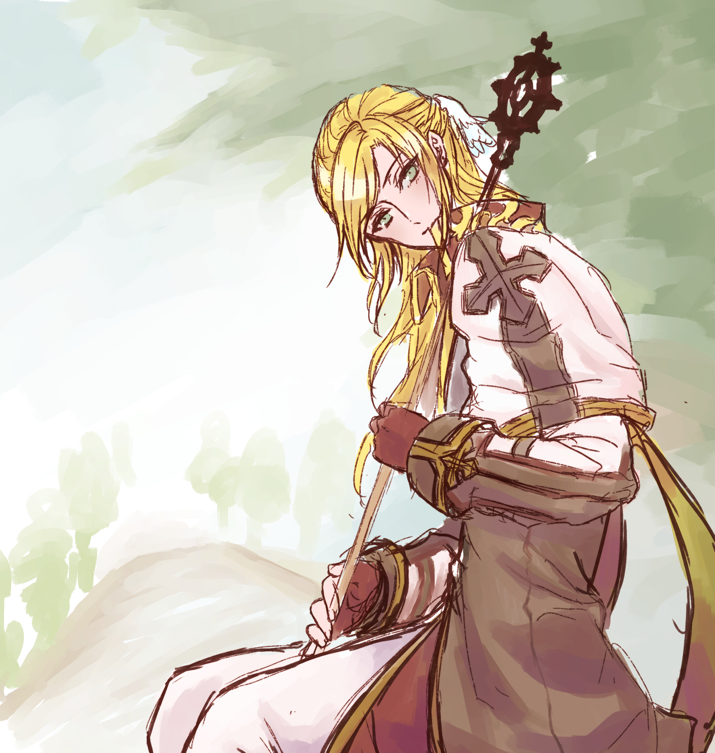 1boyblonde hairblurryblurry backgroundbrown coatbrown glovescapeletclosed mouthcoatcowboy shotcrosiercross of pronterafingerless glovesfujita (fuzuneko)glovesgreen eyeshead tiltholdingholding stafflong hairlooking at viewerlooking to the sidemale focusofficial alternate costumepantssittingsketchsmilesolostaffwhite capeletwhite pants