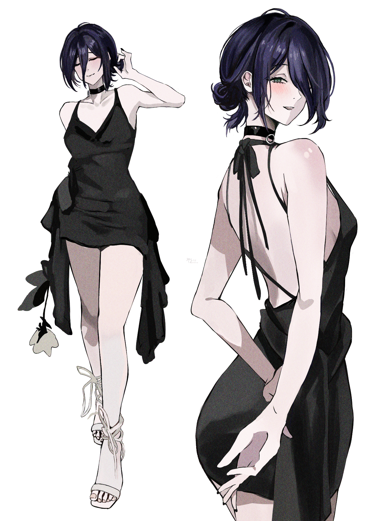 1girlblack chokerblack dressblack hairblack nailsbreastschokerclosed eyesclosed mouthdressgreen eyesgrenade pinhair between eyeshair bunhair over one eyelight smilemultiple viewssimple backgroundsmall breastswhite background