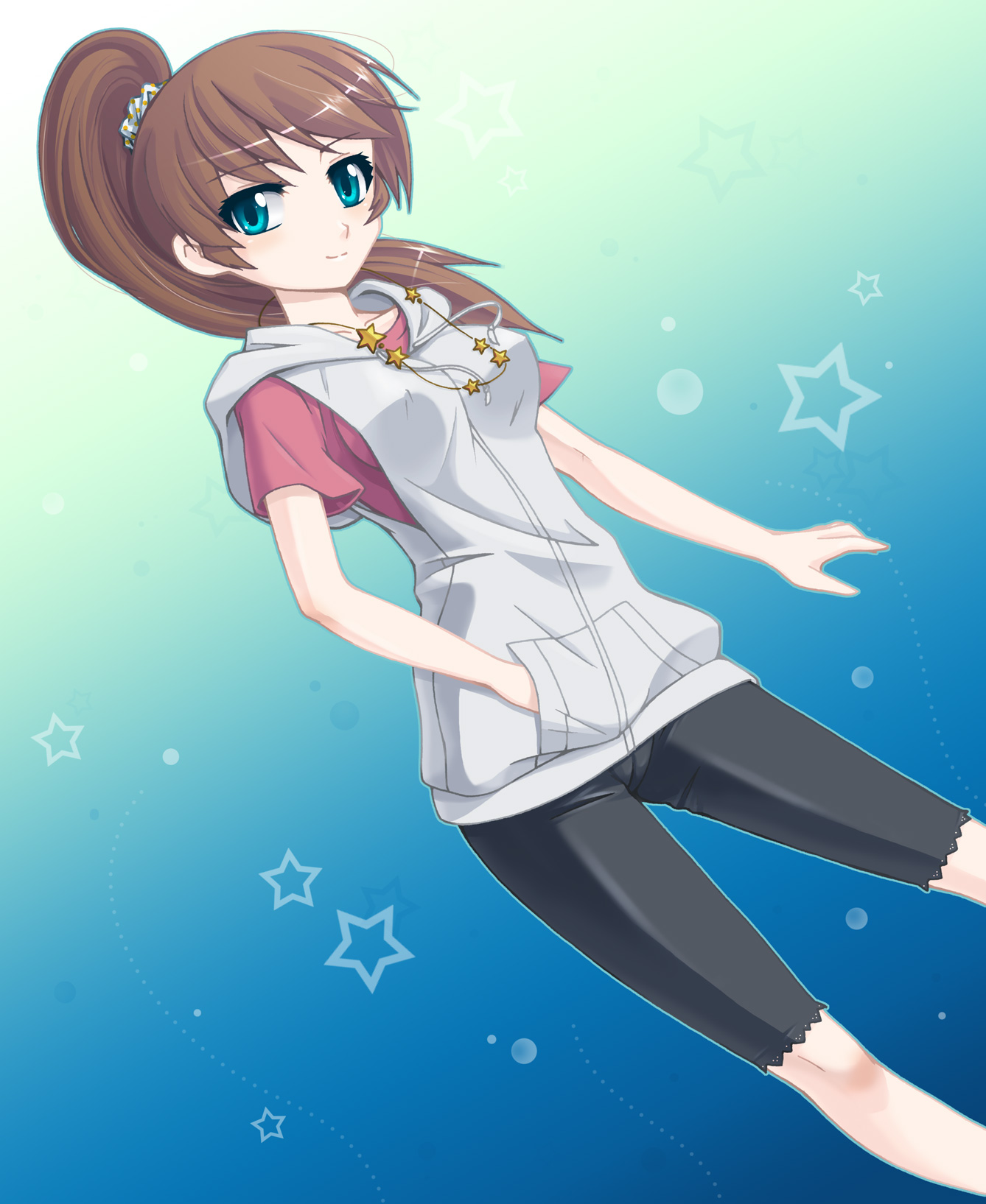 1girlaqua eyesbike shortsbreastsbrown haircollarbonecrotch seamdutch anglefemale focusgradient backgroundgreen eyeshair ornamenthair scrunchiehand in pockethigh ponytailhoodhood downhoodiejewelrylace trimlooking at viewerlooking to the sidenecklacepolka dotponytailscrunchieshort sleevessolostar (symbol)star necklace