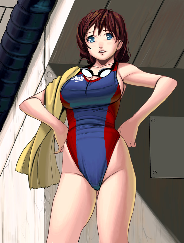 blue eyesbrown haircompetition swimsuitcowboy shotgoggleshighleghighleg one-piece swimsuitone-piece swimsuitsoloswimsuittowel