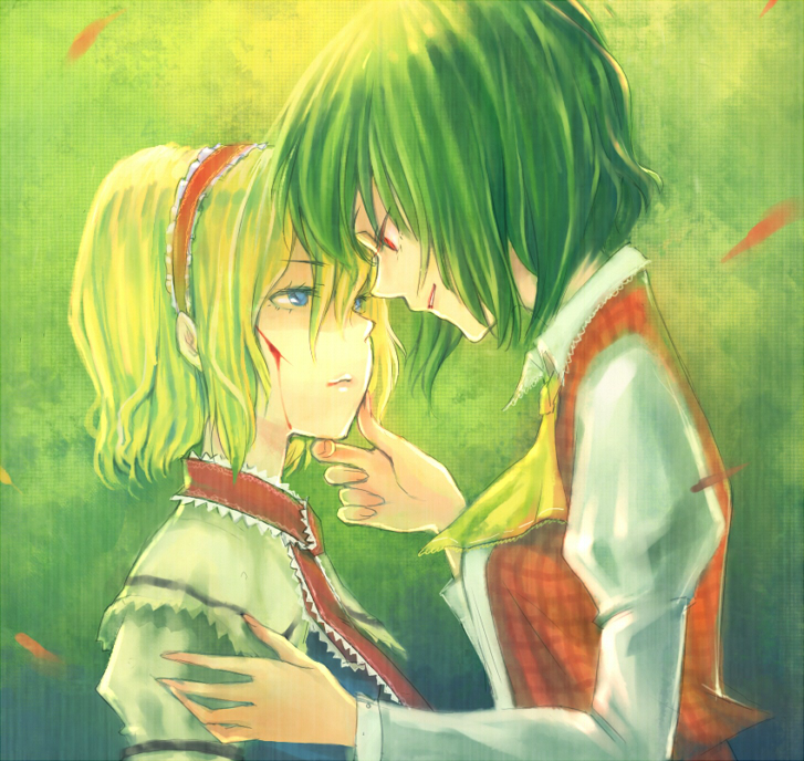 2girlsascotbleedingblonde hairbloodblue eyescutseye contactfemale focusgrabbing another's chingreen backgroundgreen hairhairbandhand on another's chininjurylipslooking at anothermultiple girlsplaid clothesplaid vestred eyesshort hairvestyuri
