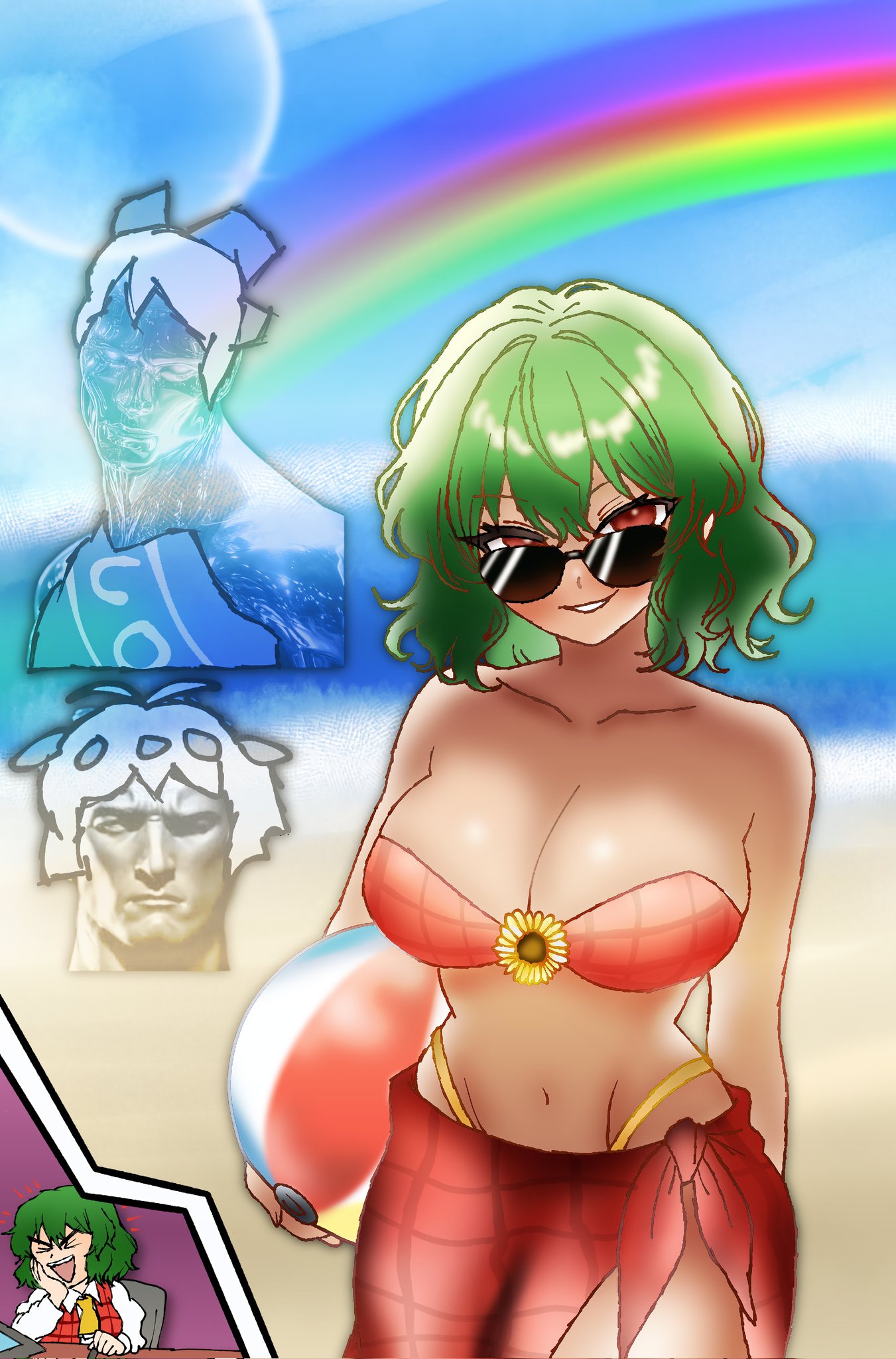 beachbikiniblue skybrabreastscleavagecollarboneflowergroinhair between eyesjusnjuanslarge breastslaughingmedium hairmememidriffnavelplaid braplaid clothesplaid sarongrainbowred bikinired eyesred sarongsarongskysunflowersunglassesswimsuitthick thighsthighsunderwear