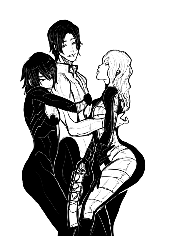 hanao akari, machiyuki ricka, momochi myu, saion-ji enju, suou yamabuki, moe! ninja girls, highres, official art, translation request, april fools, breasts, closed eyes, eating, food, fuu (moe! ninja girls), greyscale, jacket, long sleeves, medium breasts, monochrome, multiple girls, open mouth, shirt, short hair, speech bubble, standing, t-shirt, yakisobapan