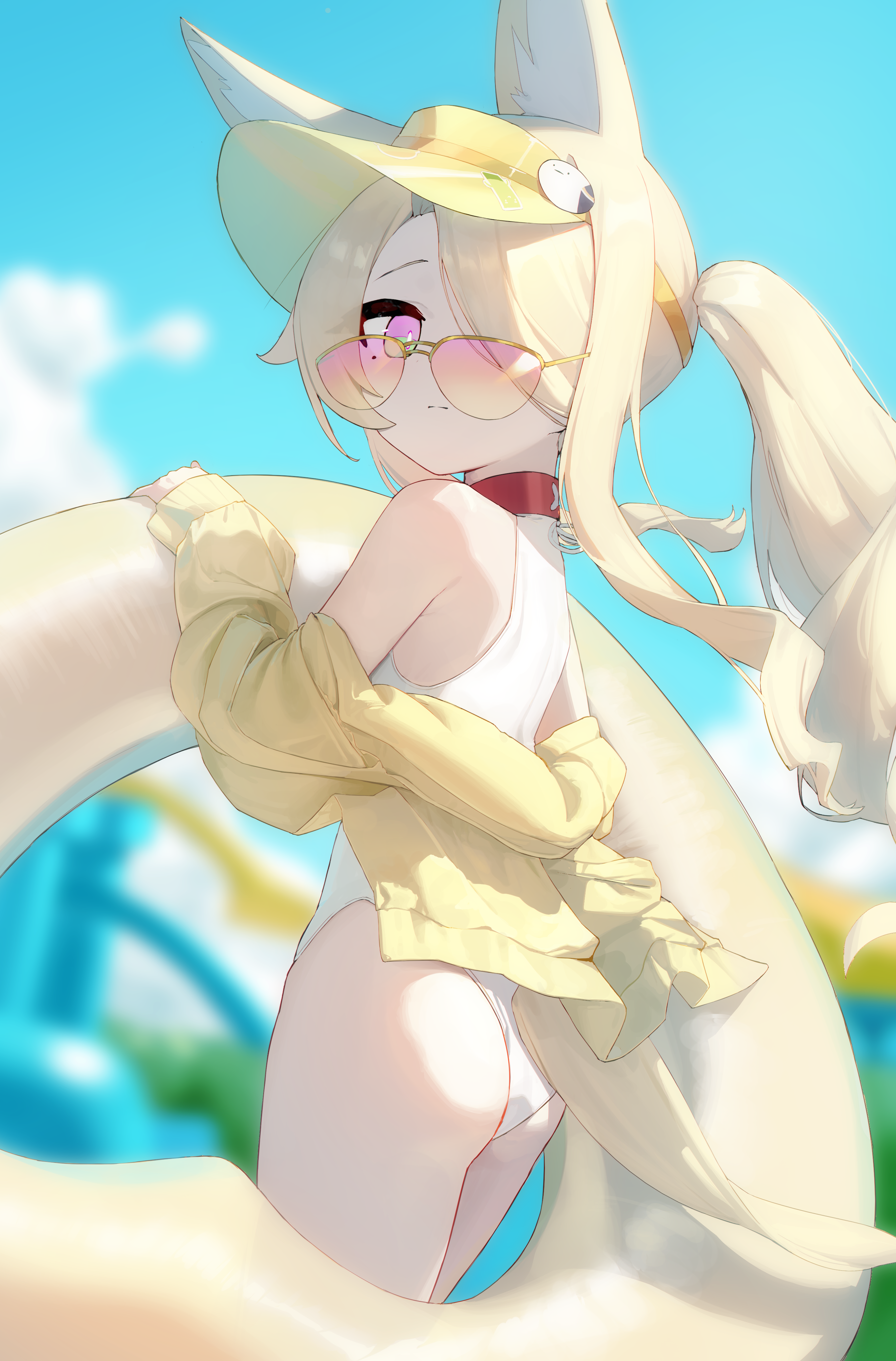 1girlanimal earsblonde hairblushdayembarrassedfox earsfox girlfrom behindfrom belowhair over one eyeholding floatielong bangslooking at vieweroff shoulderoff-shoulder jacketone-piece swimsuitorange-tinted eyewearoutdoorspink eyessolosunglassesswimsuittailtinted eyewearvisor capwavy hairwhite one-piece swimsuityellow visor