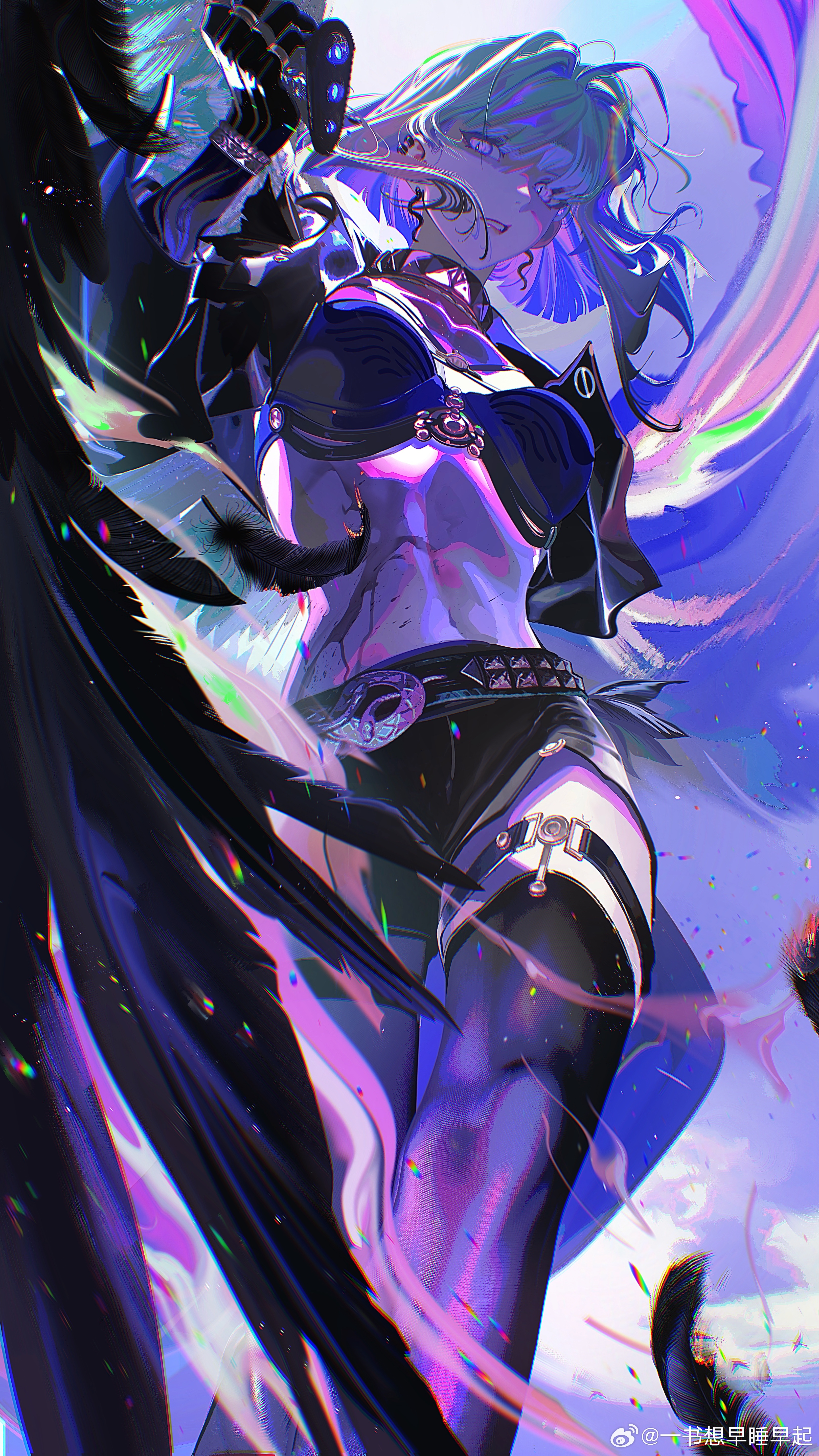 1girlasymmetrical wingsblack feathersblack pantyhoseblack shortsblack thighhighsblack wingsblue brabrabreastschromatic aberrationfeathered wingsfeathersgunholdingholding gunholding weaponlooking at viewermedium breastsmedium hairmissing commentarynavelpantyhoseparted lipspurple eyesshortssolostomachthighhighsunderwearweaponwings