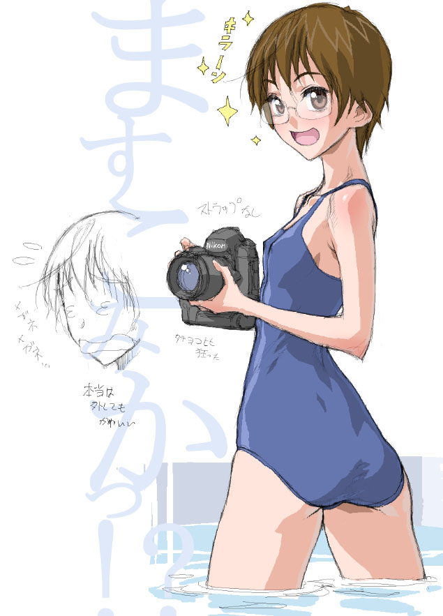 1girlblue one-piece swimsuitbreastsbrown eyesbrown haircameracovered erect nipplesglassesone-piece swimsuitopen mouthshort hairsmall breastssparkleswimsuitwading