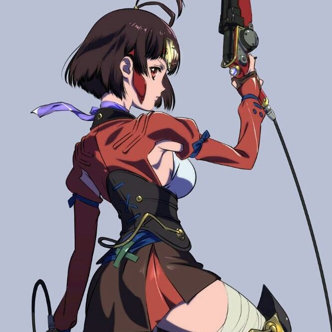 1girlarmorbandaged legbandagesblack corsetblack hairblue bowbowbreastsbrown skirtcableclosed mouthcorsetdual wieldingglovesgradient backgroundgunheadpieceholdingholding gunholding weaponlooking at viewermedium breastsred eyesshirtshort hairsimple backgroundskirtsoloweapon