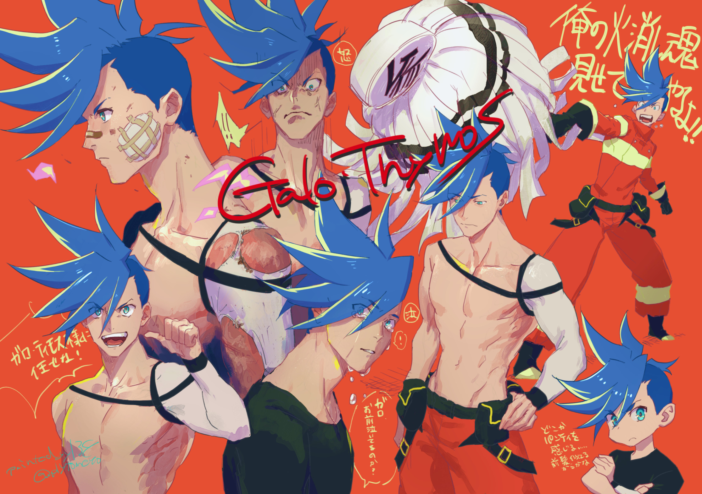1boyangrybandaidbandaid on facebandaid on noseblack shirtblue eyesblue hairburn scarclosed mouthfirefightergauzegauze on cheekholdingmale focusmatoimultiple viewsorange backgroundpectoralsscarshirtshort hairspiked hairtopless male