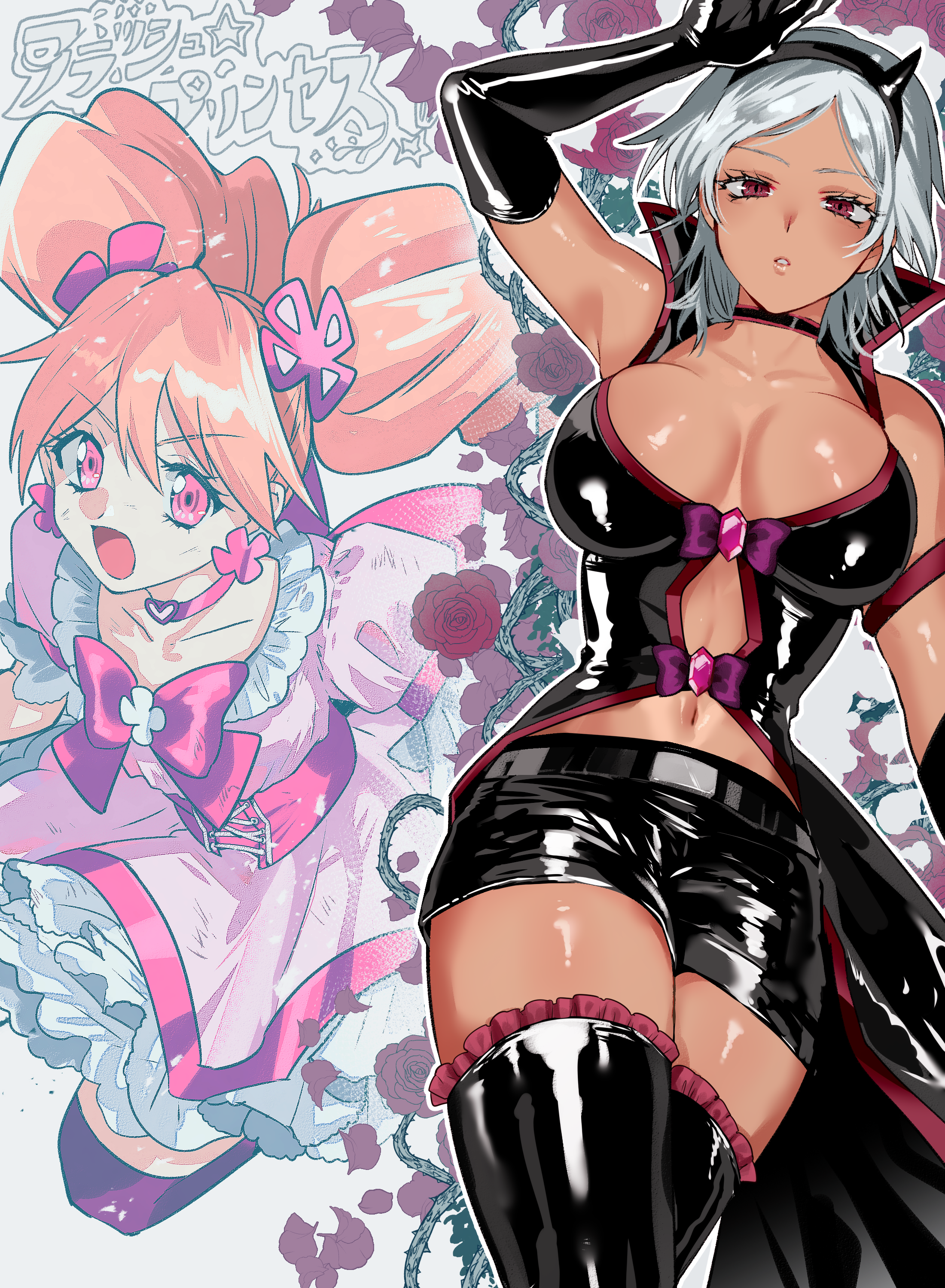 2girlsbeltblack beltblack chokerblack glovesblack hairbandblack shirtblack shortsblack thighhighsbowbowtiebreastsbrown hairchokerclover earringscoattailsdark skindark-skinned femaledressfake hornsfrilled thighhighsfrillsfrownglovesgrey hairhairbandhalf-closed eyesheath (ninja to gokudou)higashiyama seshihornslarge breastsmagical girlmedium dressmultiple girlsnadeshiko abunavelopen mouthparodyparted lipspetticoatpink bowpink bowtiepink chokerpink dresspink eyespink thighhighspre strawberry (ninja to gokudou)red eyesrevealing clothesshirtshort shortsshort sleevesshortsthighhighs