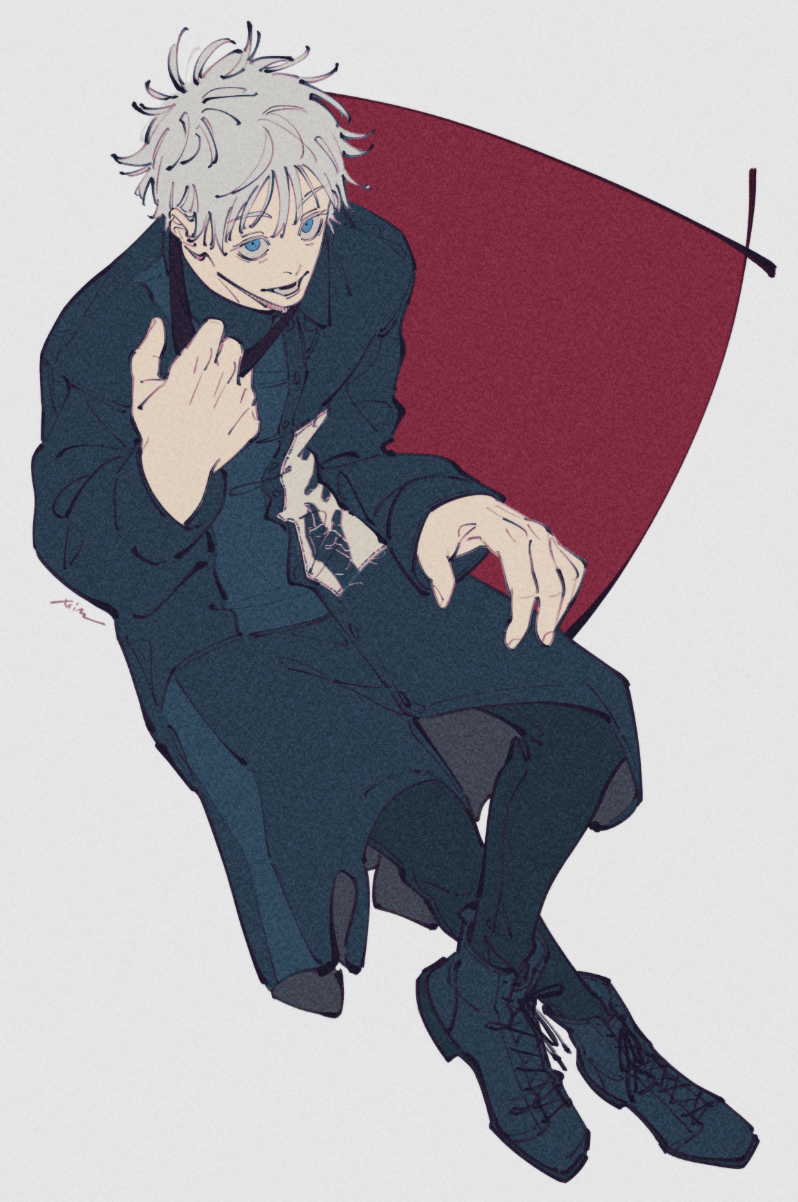 1boyblack coatblack pantsblack shoesblindfoldblindfold pullblue eyescoatcrossed anklesfull bodylong sleeveslooking at viewerlower teeth onlymale focusopen mouthpantssanpakushoelacesshoesshort hairsmilesoloteethwhite backgroundwhite hair