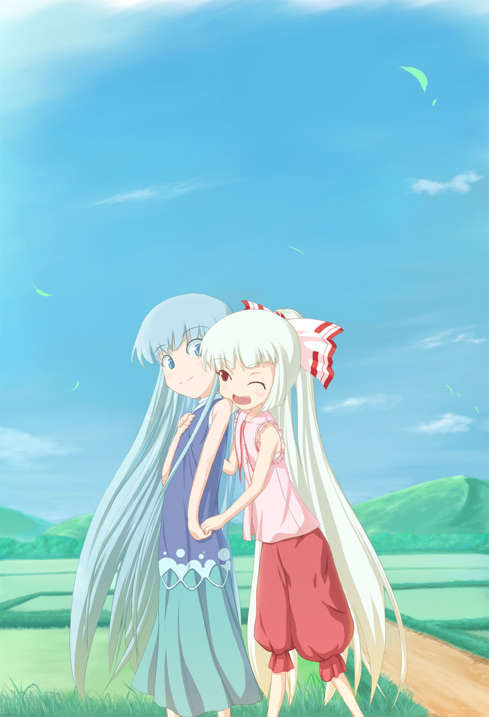 2girlsaged downblue eyesblue haircloudfemale focuslong hairmultiple girlsoutdoorsplantred eyesskywalkingwhite hairwink
