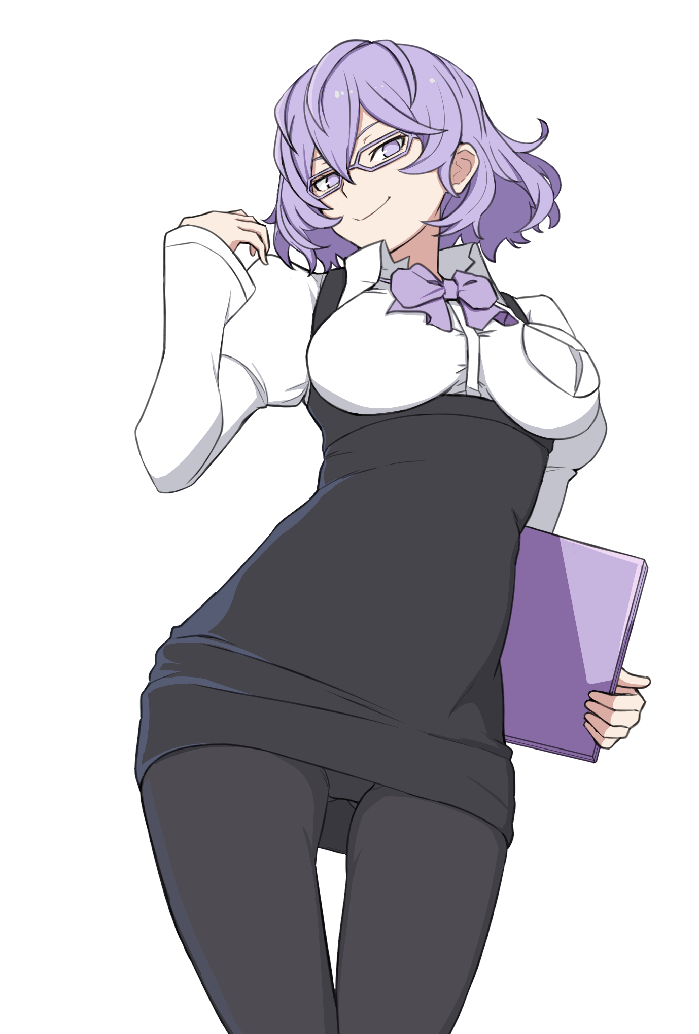 1girlayu (ddestiny944)black overallsblack pantyhosebowbowtiebreast pocketbreastsclosed mouthcomputercowboy shotglasseshair between eyesholdingholding laptoplaptoplarge breastslong sleeveslooking at viewermedium hairoverall skirtoverallspantyhosepocketpuffy long sleevespuffy sleevespurple bowpurple bowtiepurple eyespurple hairpurple-framed eyewearshirtsidelockssimple backgroundsmilesolostandingwhite backgroundwhite shirt