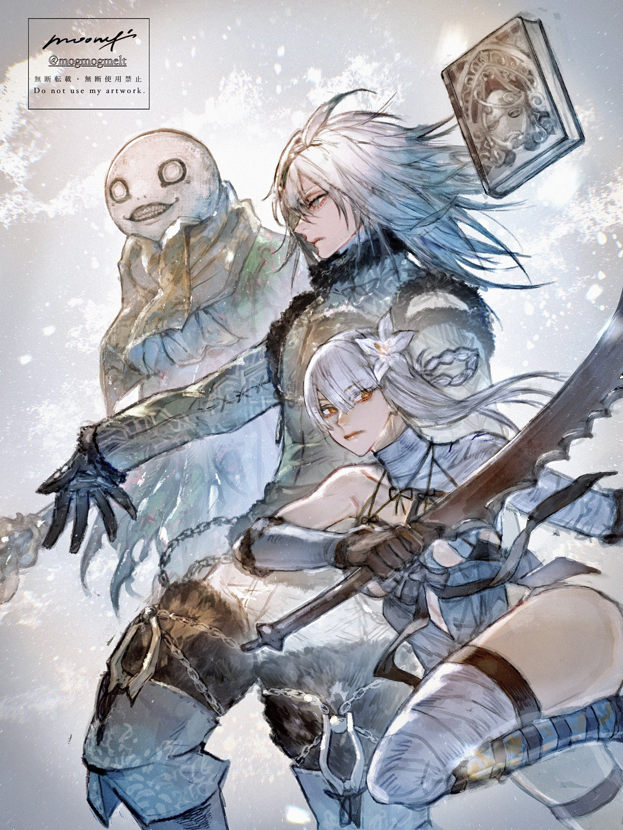 1girl2boysandrogynousartist namebandaged armbandaged neckbandagesblue eyesbookbraidbraided hair ringschainfloatingfloating bookfloating hairfloating objectflowerfur trimfur-trimmed jacketgrey backgroundhair flowerhair ornamenthair ringsholdingholding swordholding weaponjacketlingerielong hairmultiple boysnegligeeparted bangsred eyesswordunderwearwatermarkweaponwhite flower