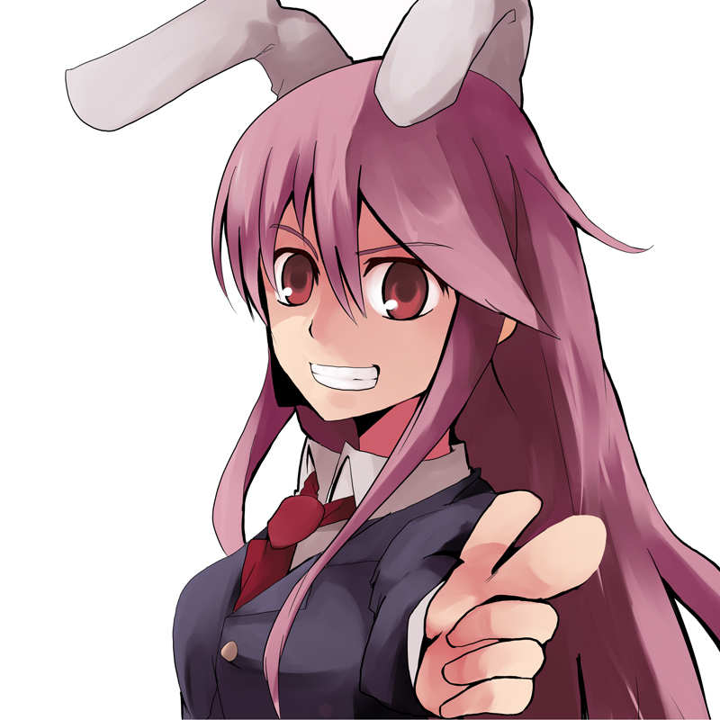 1girlanimal earsfemale focusfinger gungrinlong hairpink hairpointingpurple hairrabbit earsred eyessimple backgroundsmilesolowhite background