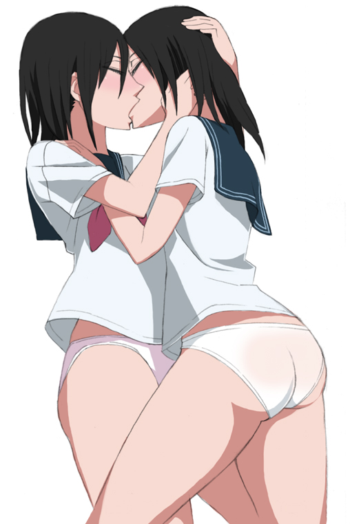 2girlsblack hairblushbottomlessclosed eyescouplekissmultiple girlsno pantspantiespink pantiesschool uniformserafukuunderwearwhite pantiesyuri