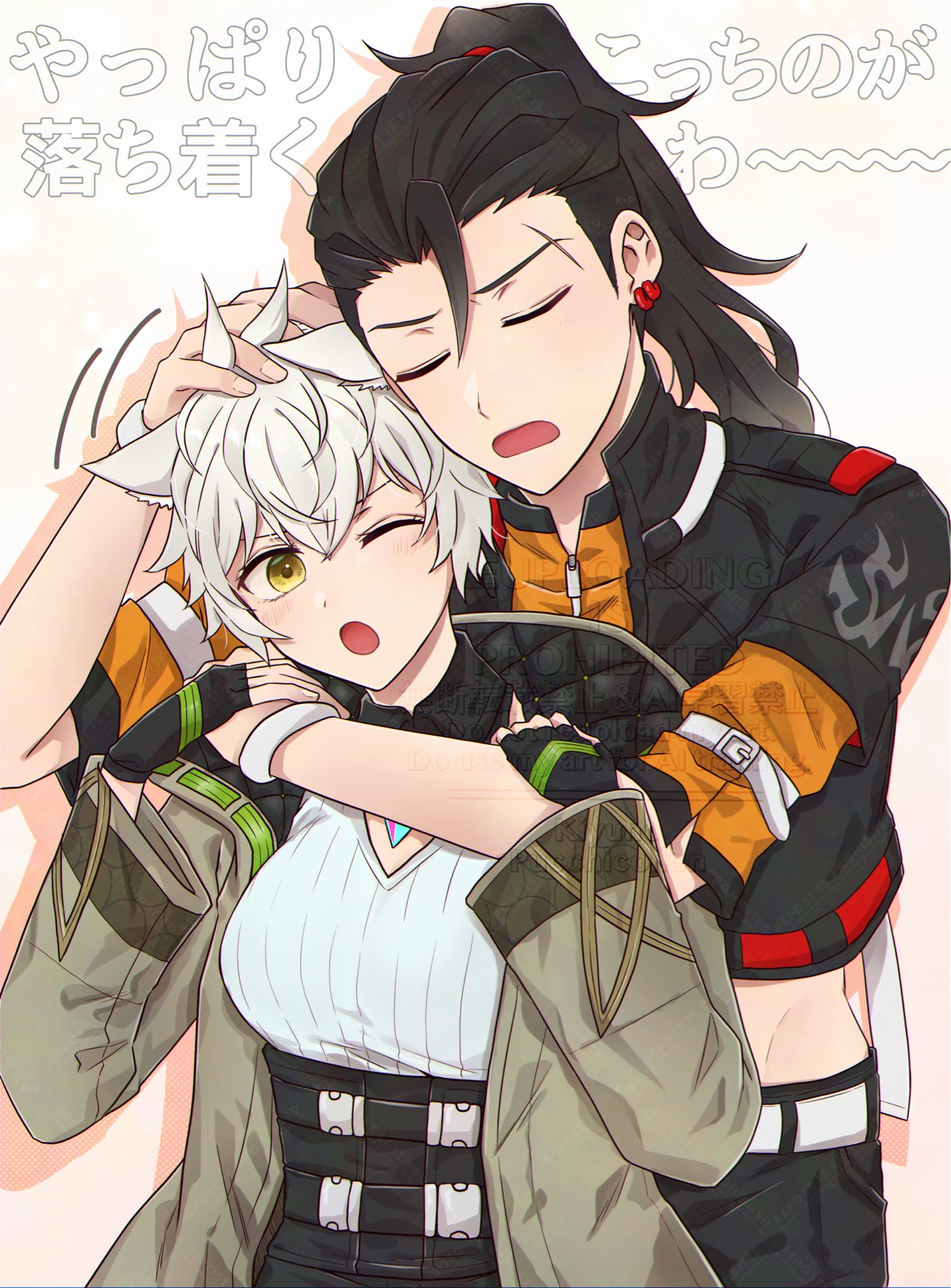 :o1boy1girlanimal ear fluffanimal earsbeltblack glovesblack jacketblack pantsblack shortsbreastsbrother and sistercat earscat girlcropped jacketfingerless glovesglovesgrey jackethigh-waist shortshoodhooded jackethughug from behindjacketlarge breastsone eye closedopen clothesopen jacketopen mouthpantsshortssiblingsstandingwhite hairyellow eyes