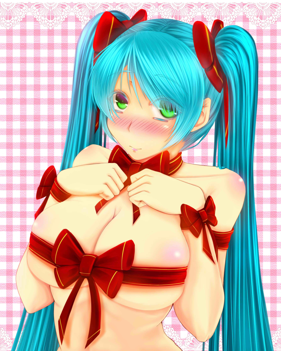 aqua hairblushbowbreastscheckeredcheckered backgroundchokerfemaleFlag for Deletionfull-face blushgreen eyeshair ribbonhairbowhand on own chestlarge breastslong hairnuderibbonsmilesolotied hairtwintails