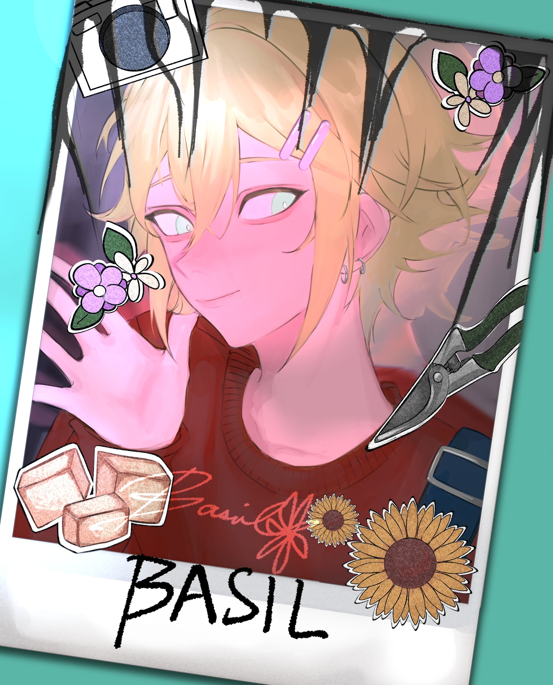 harutoyumaarts, michinoku komaro, seitokai ni mo ana wa aru!, absurdres, commentary request, highres, 1girl, artist name, blue background, blue buruma, blue eyes, blue trim, border, breasts, buruma, closed mouth, cowboy shot, gym uniform, huge breasts, long hair, looking at viewer, midriff, outside border, pink hair, ponytail, shirt, solo, sweat, twitter username, white border, white shirt