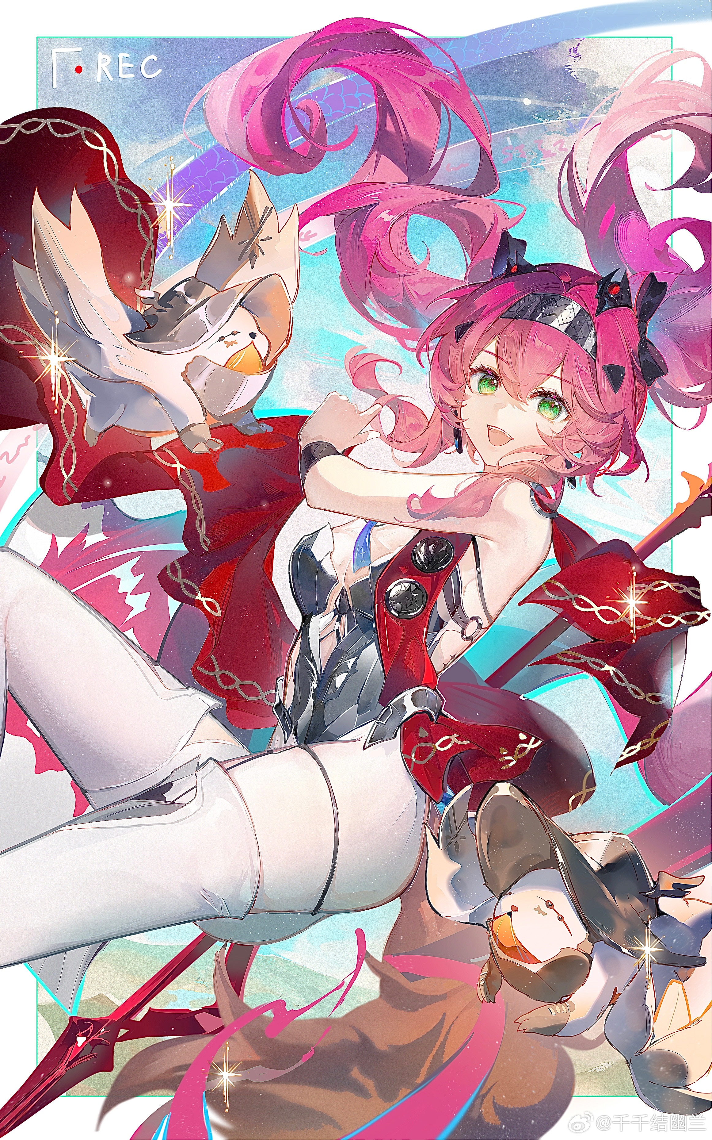 1girlarmorbare shouldersblack bowbodysuitbowbreastplatebreastsfloating hairgreen eyeshair between eyeshair bowhair floating upwardshairbandlong hairlooking at viewermedium breastsmetal hairbandmissing commentarymultiple hair bowsopen mouthpink hairsmilesolotacet discord (wuthering waves)tacet mark (wuthering waves)twintailswhite bodysuitwrist guards