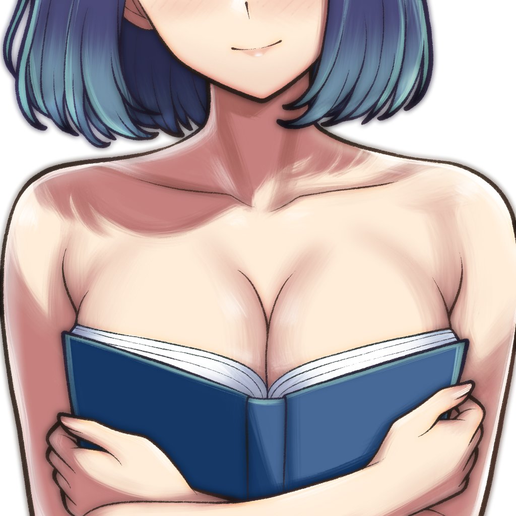 1girlblue eyesblue hairboobs in book (meme)bookbook on breastsbreast focusbreastsclosed mouthcollarbonecovering breastscovering privateseyes out of framehead out of frameholdingholding booklooking at viewermedium breastsmemeopen booksmilesolowhite background
