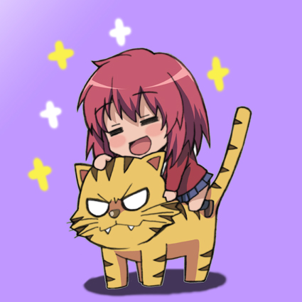 :d00s1boy1girlblushcatchibiclosed eyesfemale focusopen mouthpurple backgroundred hairshort hairsmilesolosparkletiger