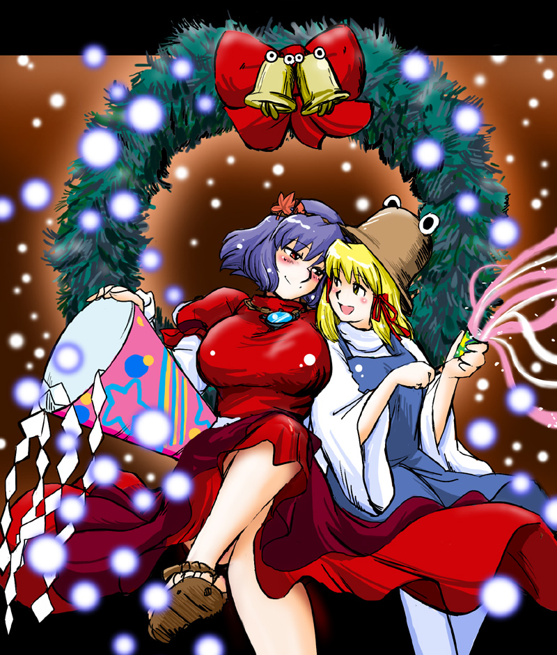 2girlsbellblonde hairblue hairblushbowbreastschristmascleavagedressfemale focusgrey eyeshair ribbonhairbandhathugjewelrylarge breastsleafmultiple girlsnecklacepantyhosependantpurple hairred eyesribbonsandalsshort hairsittingsmilesnowwhite pantyhosewreathyellow eyes