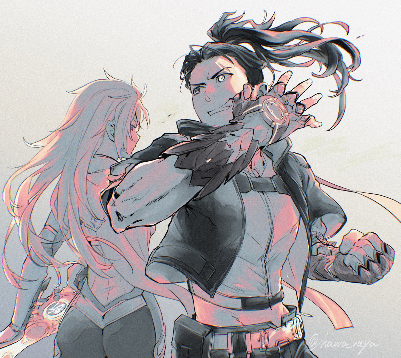 an sin, magia azure, magia baiser, mahou shoujo ni akogarete, highres, 2girls, ahoge, alternate costume, black hair, black kimono, blue kimono, breasts, breasts out, censored, censored nipples, clothes pull, collarbone, fang, green hair, hair intakes, heart, heart-shaped gem, heart ahoge, horns, huge ahoge, japanese clothes, kimono, magical girl, multiple girls, red eyes, star-shaped gem, star-shaped pupils, star (symbol), symbol-shaped pupils, twitter username, watermark, yellow eyes, yuri