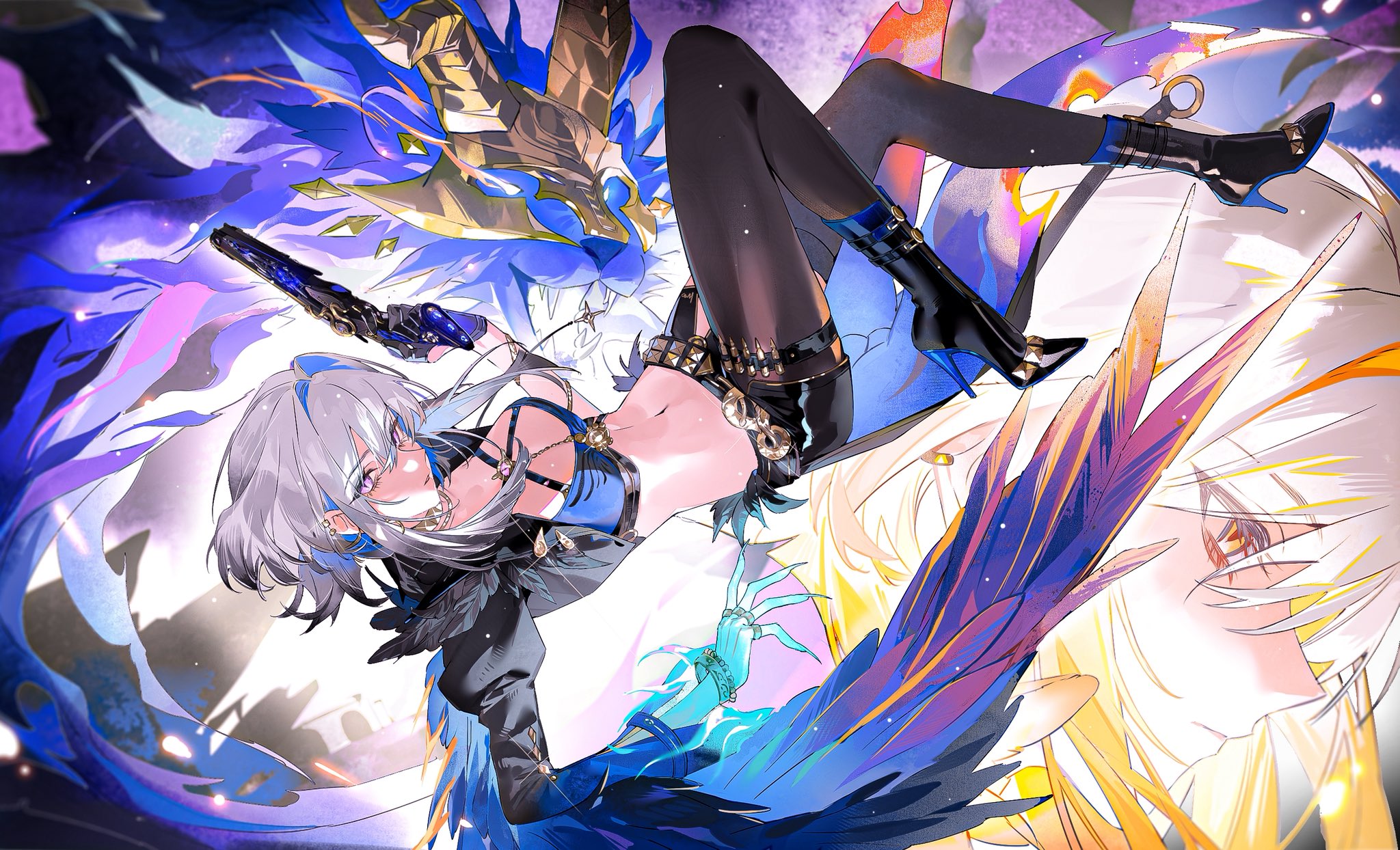 1girlasymmetrical wingsblack bootsblack jacketblack pantyhoseblack shortsblack thighhighsblue brabootsbrabreastscolored inner hairfeathered wingsgrey hairgunhigh heelsholdingholding gunholding weaponjacketlooking at viewermedium breastsmedium hairmulticolored hairmultiple viewsmutationnavelpantyhoseparted lipspurple eyesshortsstomachtacet discord (wuthering waves)thighhighsunderwearweaponwings