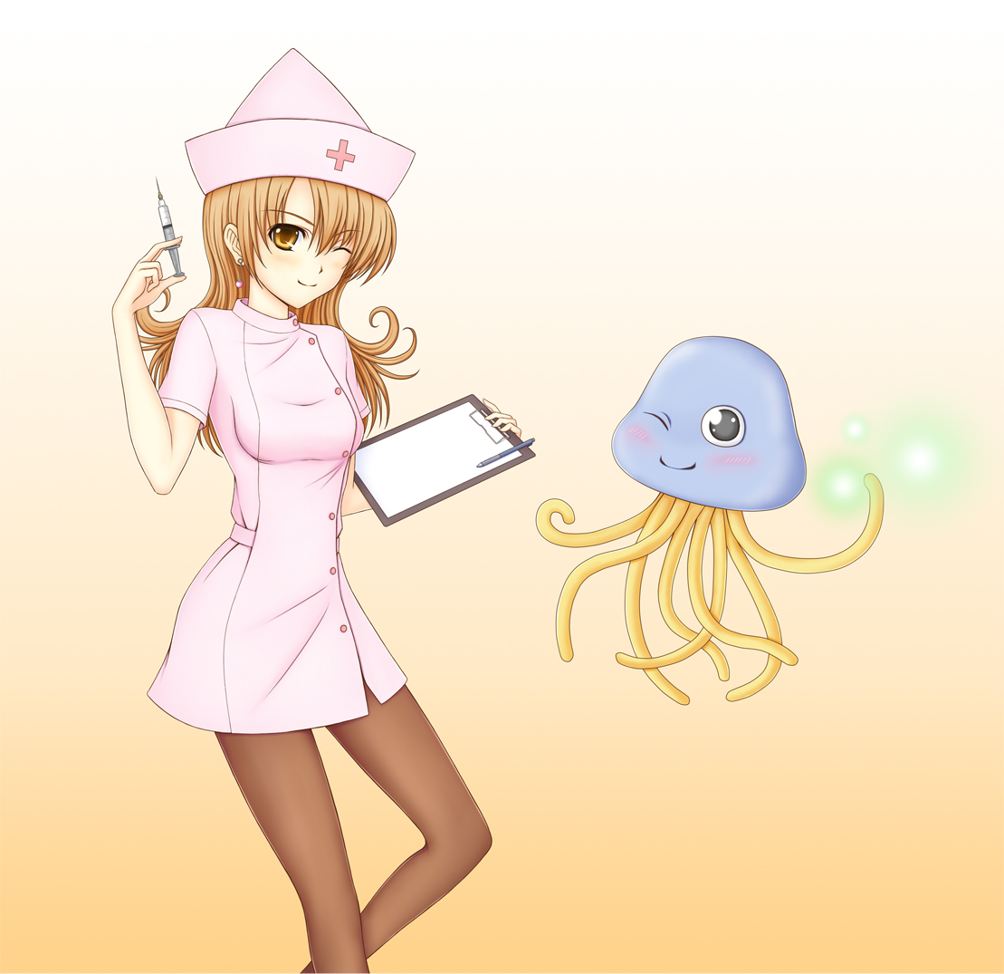 1girlalternate costumeblack eyesblushbreastsbrown pantyhosebuttonsclipboardcrossdressearringsfemale focusflyingglowinggradient backgroundhair between eyeshatholdingjewelrylight smilelong hairlooking at viewermagicnarrow waistnurseone eye closedorange backgroundorange eyesorange hairpantyhoseparted bangspenred crossred hairshort dresssmall breastssmilesolostandingsyringetentacleswinkyellow eyes