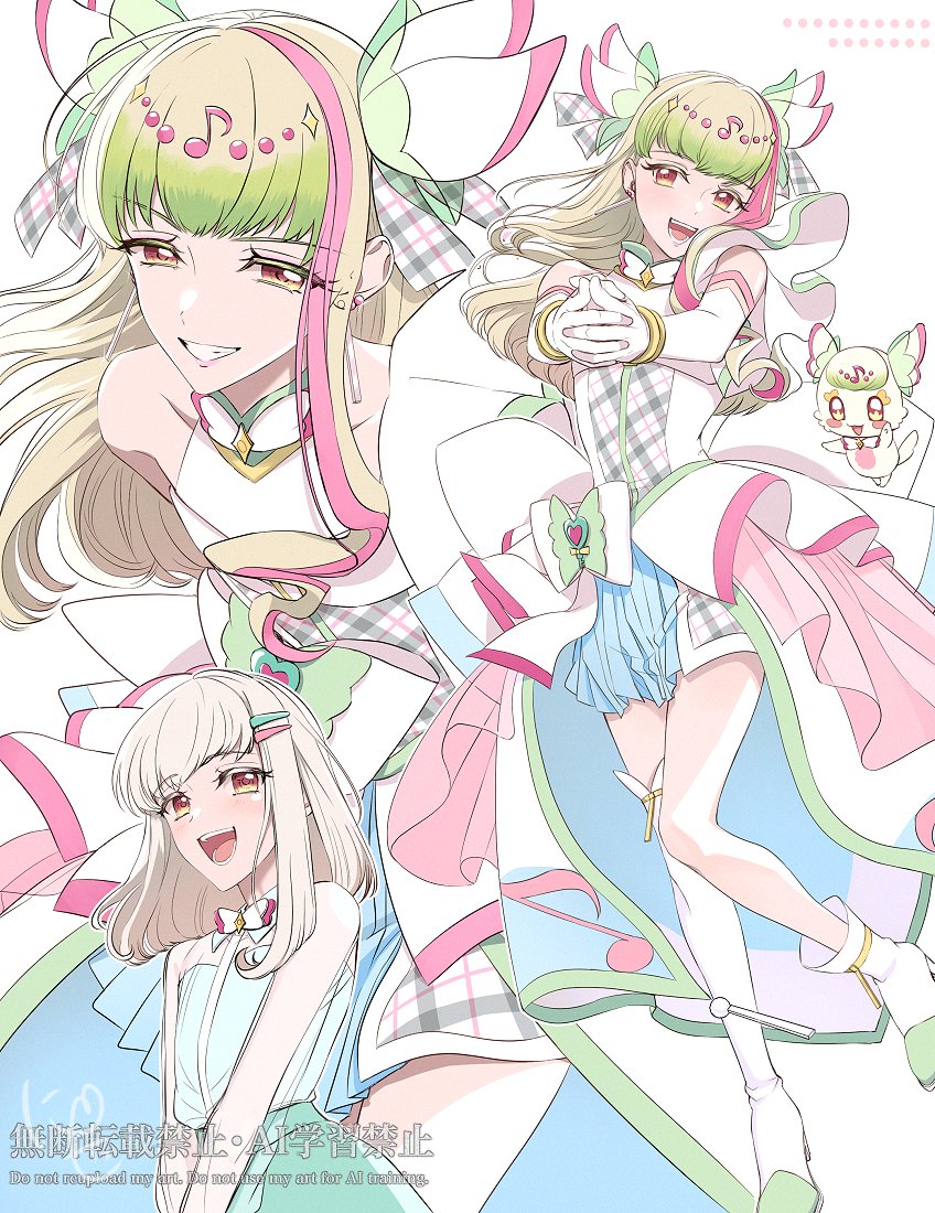 1girlbare legsbare shouldersblonde hairblunt bangsbob cutbootsbubble skirtchokerdresselbow glovesfortissimofrilled ribbonfrillsfull bodygingham dressglovesgradient hairgreen hairgreen shirtgreen skirthair extensionshair ornamenthair wingshairpinheart-shaped lockholding own handkneehighsleg uplong hairminiskirtmulticolored hairmusical notemusical note hair ornamentopen mouthpuffy dresspuffy sleevespurirun (civilian) (precure)purirun (fairy) (precure)ribbonribbon chokersample watermarksee-through clothessee-through shirtsee-through sleevesshirtshort dressshort hairsignaturesingle bare legsingle kneehighsingle sleevesingle sleeve cuffsingle socksingle wide sleeveskirtsmilesockssolosolo focusstandingstanding on one legstuffed animalstuffed toywatermarkwhite dresswhite gloveswing hair ornamentwrist cuffs