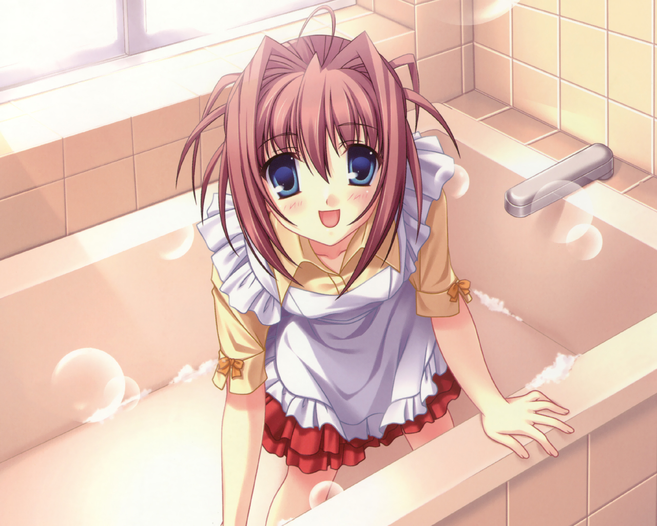 bolze, kurusu tomari, osaragi hazumu, kashimashi, megami magazine, absurdres, highres, scan, 00s, 2girls, :d, blonde hair, blue eyes, blush, buruma, closed eyes, english text, gym uniform, hug, hug from behind, multiple girls, one-piece swimsuit, open mouth, orange hair, red hair, school swimsuit, shirt, smile, swimsuit, towel, twintails, undressing, wet