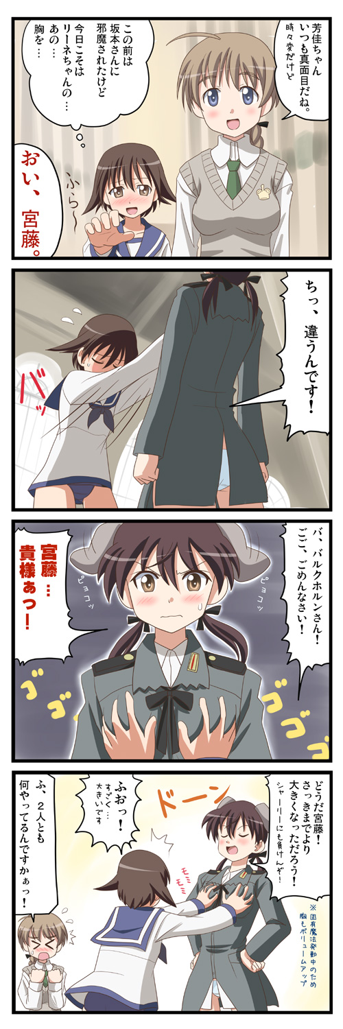 kusukusu, nozawa hanano, choir (game), game cg, 1boy, 3girls, :o, blue eyes, blue hair, blush, breast press, breasts, ear licking, earlick, femdom, girl sandwich, green hair, licking, multiple girls, pink hair, red hair, sandwiched, tongue, yellow eyes