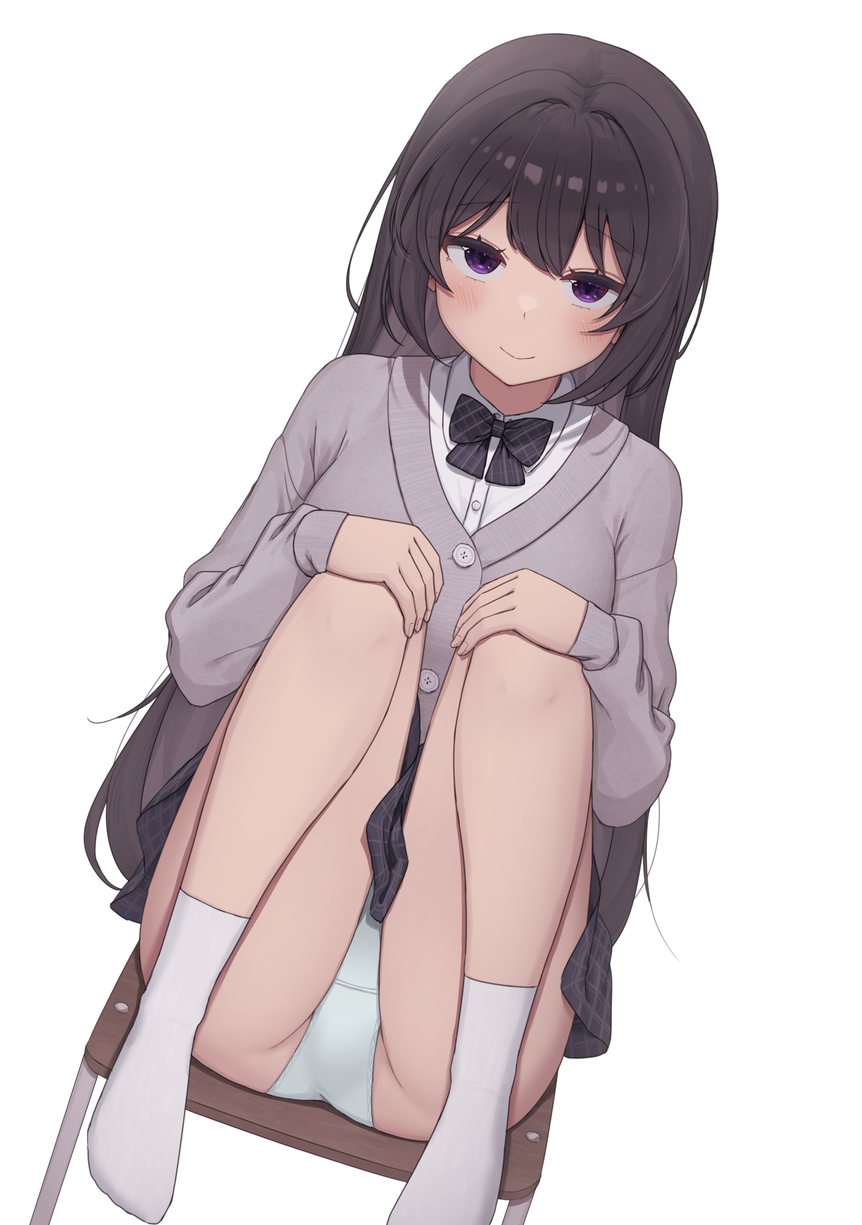 tomimon, kanoe (blue archive), blue archive, commentary request, highres, !?, 1girl, 1other, ^^^, blush, bow, brown bow, brown eyes, collared shirt, diagonal-striped bow, disembodied hand, dress shirt, grey hair, grey vest, hair between eyes, halo, hands up, long hair, long sleeves, nose blush, open mouth, puffy long sleeves, puffy sleeves, shirt, simple background, spoken interrobang, striped bow, surprised, two side up, upper body, very long hair, vest, wavy mouth, white background, white shirt