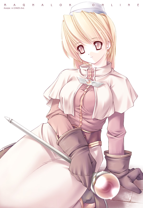 1girlanimal earsbare legsblack glovesblonde hairblushbrown eyesfemale focusglovesholdinglooking at viewerrabbit earsrodsimple backgroundsolothighswhite background
