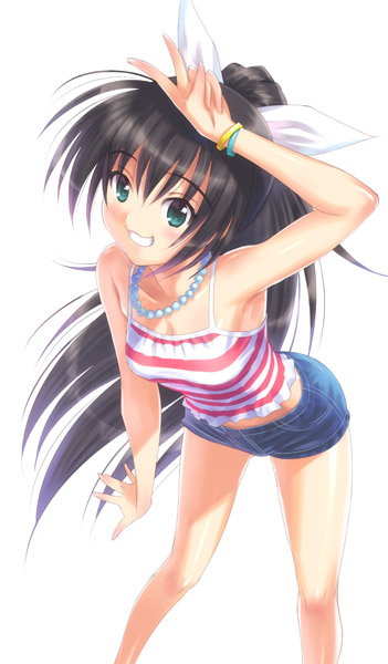00s1girlaqua eyesblack haircamisoledenimdenim shortsfemale focusjewelrylong hairnecklaceponytailshort shortsshortssimple backgroundsolov
