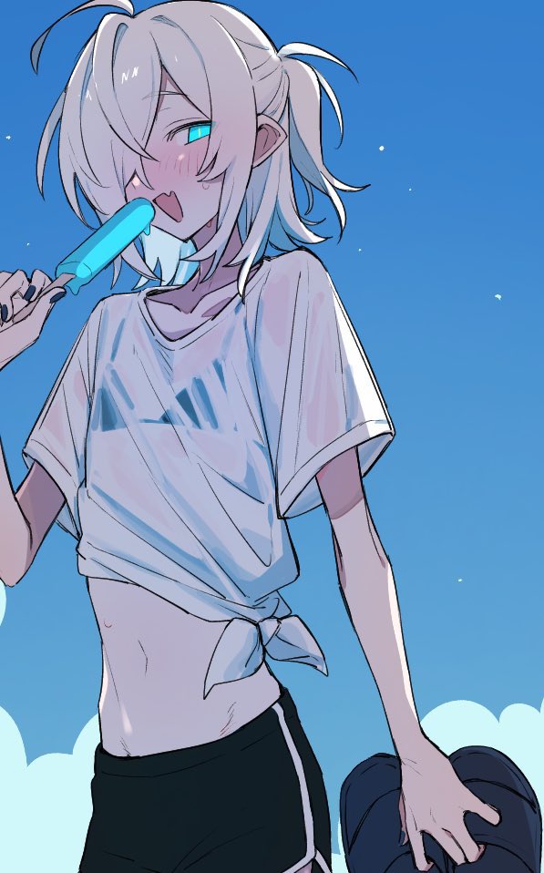 doroshe (sdpw8474), blue archive, absurdres, bad id, bad pixiv id, commentary request, highres, textless version, variant set, 1boy, 1girl, collarbone, ear licking, grey hair, kanoe (blue archive), licking, long hair, open mouth, red eyes, saliva, solo focus, teeth, tongue, tongue out, upper teeth only